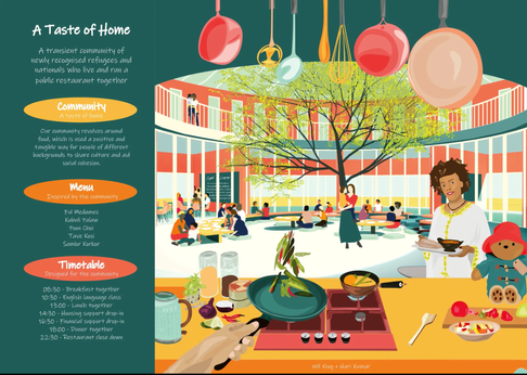 Two examples from the Co-Living brief. 'Curious minds society' focuses on uniting different individuals and families to embrace and encourage community spirit through creativity. The 'Taste of Home' project unifies minority groups and provides a living and support system through the opening of a restaurant, run by the residents.